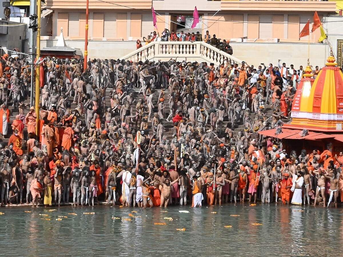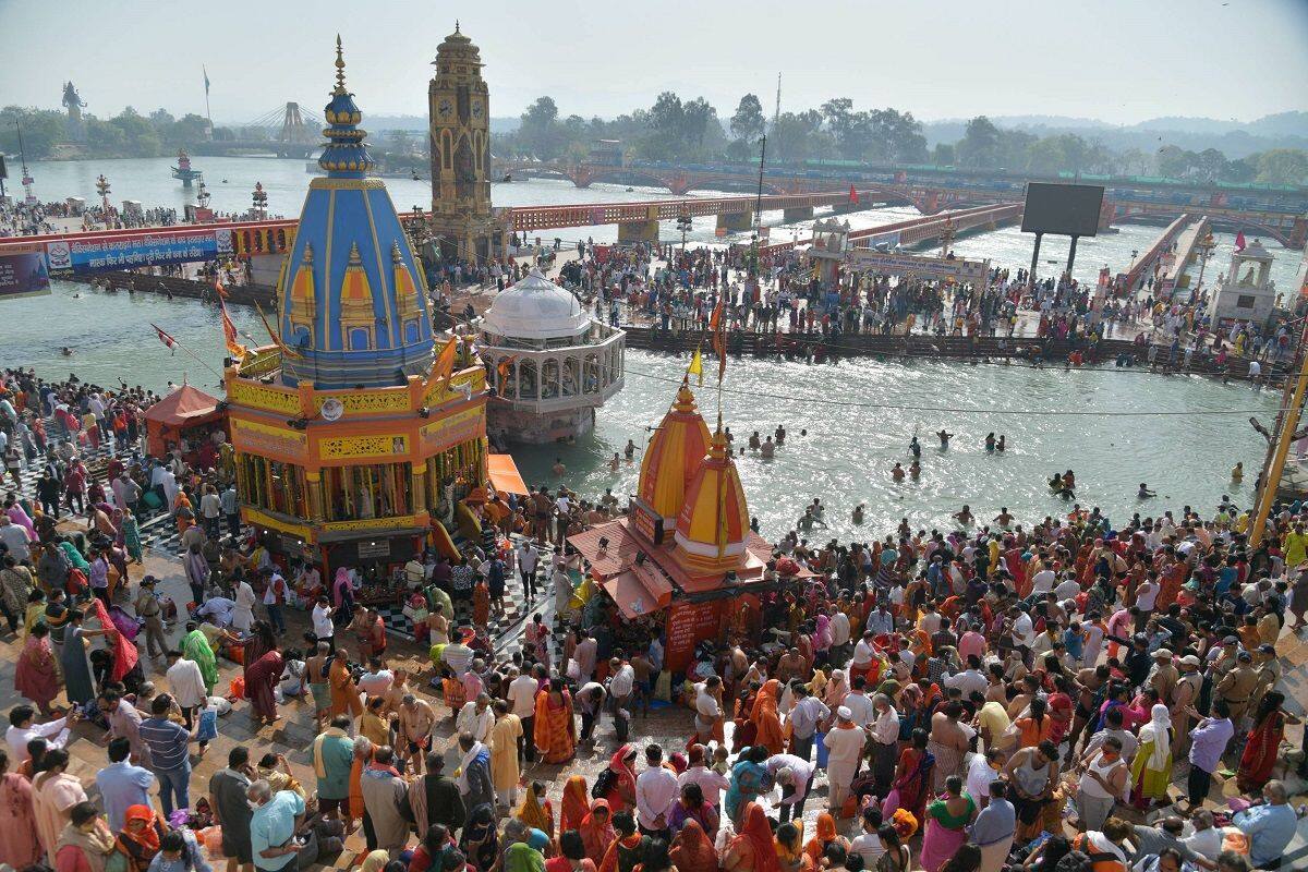 Thousands of devotees, some of them without masks, gathered by the river ganges in uttarakhand's haridwar on sunday in densely packed crowds.